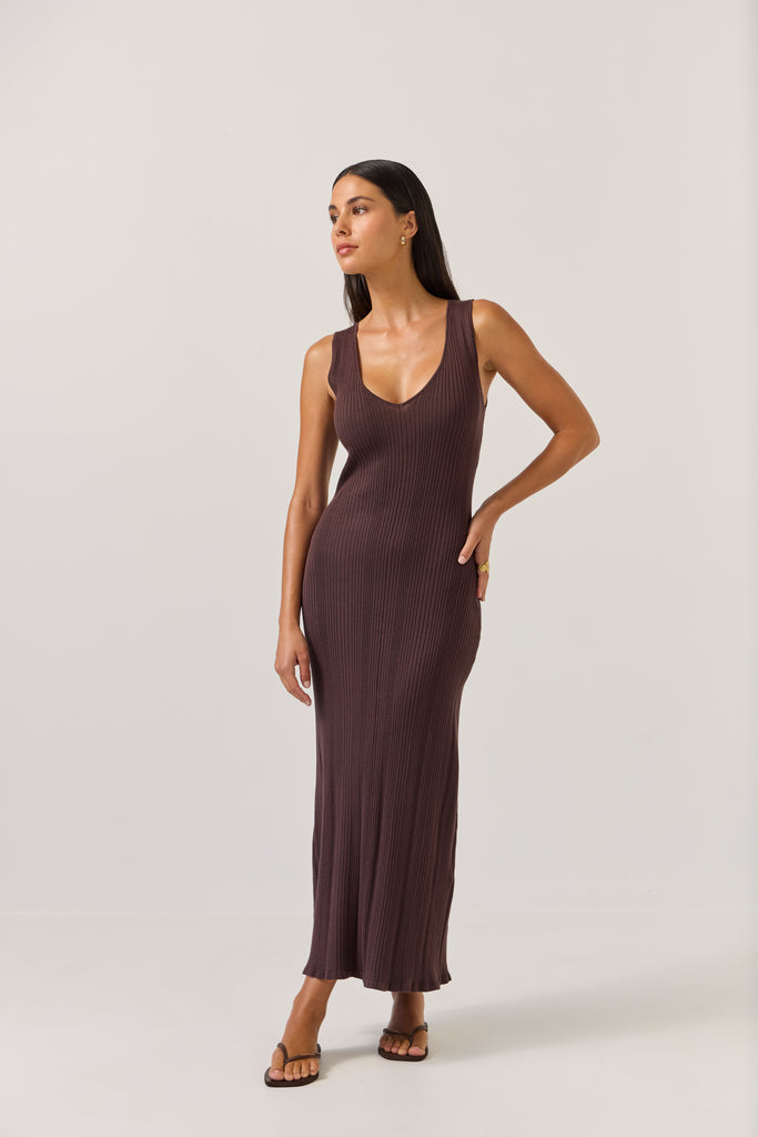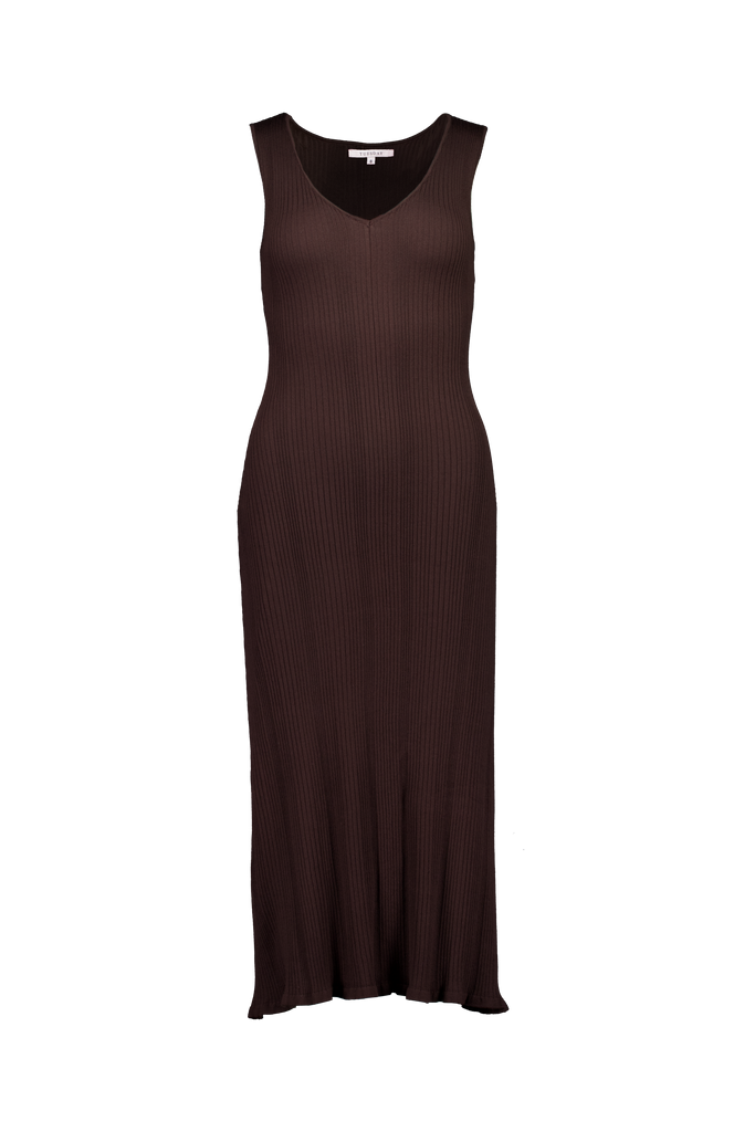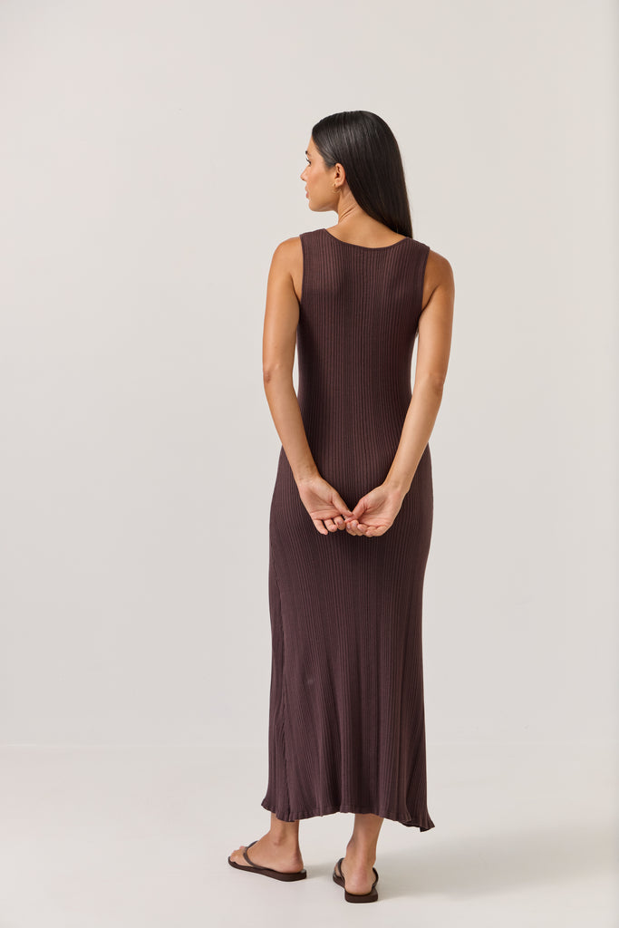 A knit dress to rival all others! In a soft & stretchy rib, this striking shape skims the body, falling slimly to the ankle. Layer a cotton shirt overtop on days you prefer more coverage.