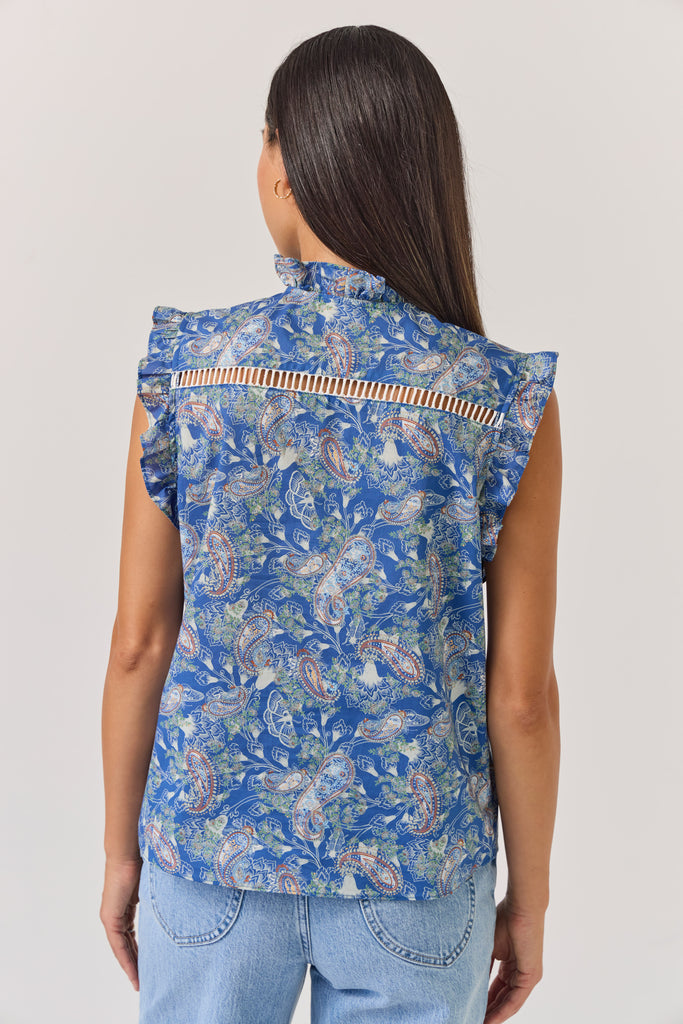 • multi-coloured paisley print on blue ground