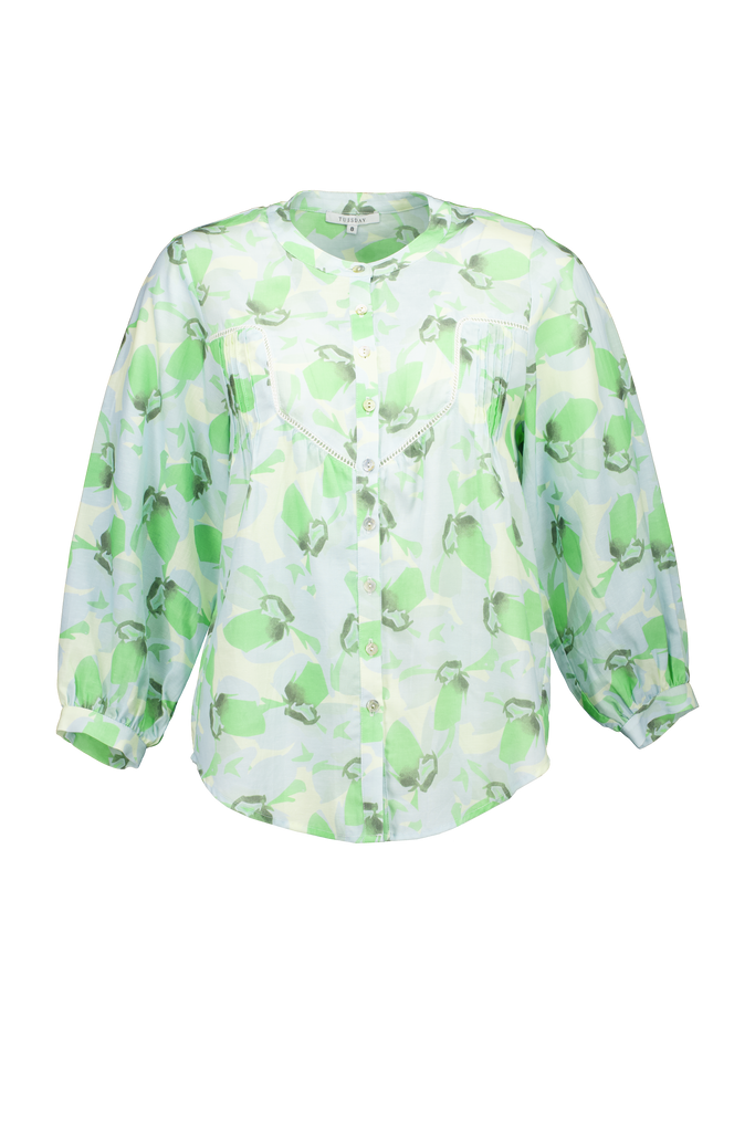 • abstract floral print in soft blue, green, and off-white tones