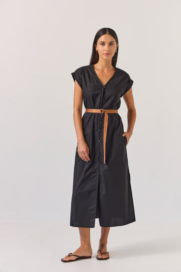A beautifully simple new dress with chic sophistication. In quality cotton poplin she’s that piece that will take you anywhere and everywhere. This beauty looks effortlessly elevated with slides or sandals and is a fantastic workwear option too. Swap out the belt for instant styling options, or wear without one at all.